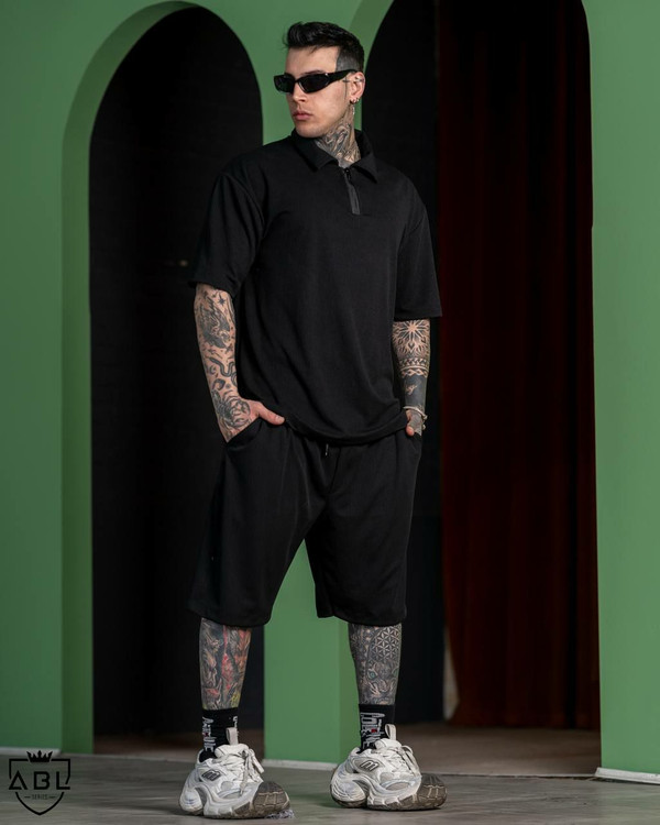 ست نیم زیپ مشکی مردانه | تیشرت و شلوارک پارچه مراکشی